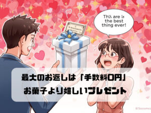 3月14日はホワイトデー。「お返し」を期待している方も、これから不動産屋に行く方も。ソコスモからのプレゼントは、お菓子ではありません。「仲介手数料(家賃1ヶ月分)」という、本来なら支払うはずだった10万円近いお金を「0円」にしてお返しします。その浮いたお金で、パートナーと高級ディナーに行くのが、一番賢いホワイトデーの過ごし方です。